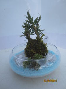 例年今の時期は葉牡丹などの寄せ植えを作っています。今年は寄せ植えはやめて、新しい事にチャレンジしています。(お正月用の苔玉を作っています。オープンガーデンでも販売予定をしています。)創作苔玉としてガラスの水盤に苔玉を入れてみました。
