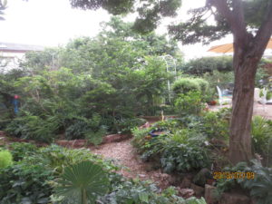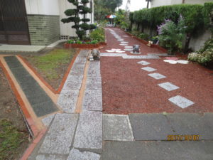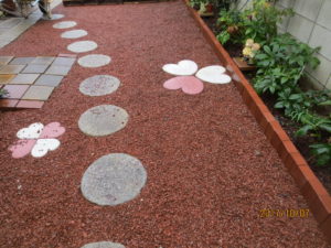 模様替えいたしました。左側の植栽コーナーが雪の妖精、氷の薔薇マーブルシリーズが植栽してあります。 レンガや白い玉石、自分で内作いたしました。